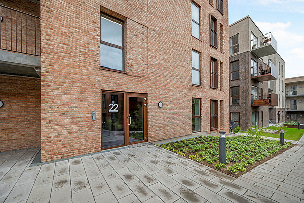 Alle bygningerne er med facader i tegl, som varierer i farverne mørkebrun, lys gul, lys rød og rød. Det giver et flot farvespil i boligområdet og sørger samtidig for, at bygningerne kan kendes fra hinanden. I facaderne er der mange små variationer som gør bygningerne mere interessant, fx forskellige størrelser vinduer, tilbagetrukne vinduer, franske altaner og altaner.